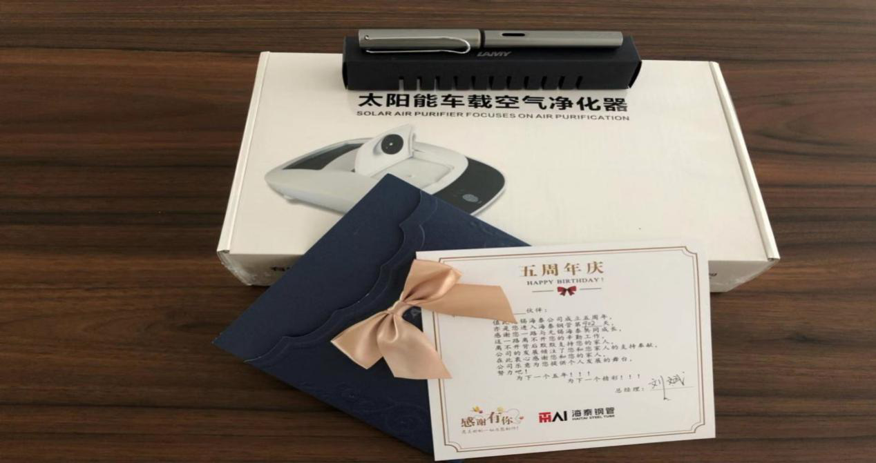當然,雖然這次5周年只是簡單的以交流會的形式展開,但是公司不忘給每個員工準備了禮物——鋼筆和車載凈化器。交流會結束后,每個員工臉上洋溢著笑容,此次交流會圓滿結束。