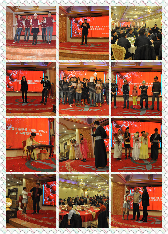 上海海泰鋼管(集團)有限公司2014年新春聯歡晚會于1月17日晚在上海榕港海鮮大酒店隆重舉辦,此次晚會在董事長丁勁松先生的精彩致辭 中拉開序幕。整臺晚會節目精彩紛呈,佳作迭出。一支青春動感的舞蹈表演,體現了年輕人無限的活力;古箏表演韻味十足的舞臺情景劇《笑 傲漿糊》點爆全場,現場一片沸騰,掌聲和歡呼聲不斷。最后晚會在我們銷售二部同仁的集體大合唱中落下帷幕,一首《明天會更好》充分表 達了海泰員工對公司的美好祝愿。這次晚會不僅僅是嗅覺和味覺的盛宴,更是精神和視覺的盛宴。整個晚會將多個表演節目、抽獎活動和游戲互動等環節精心的穿插在一起, 多樣化的節目使大家耳目一新,歡笑快慰。佳作紛呈的演出不但彰顯了員工們的個人才藝,也體現了企業團隊的力量、合作、凝聚力和同事之 間情感的溝通。此次晚會既是一場表演,但更是一場情感的交流,演員之間,觀眾之間,演員與觀眾之間,大家的快樂相互感染。