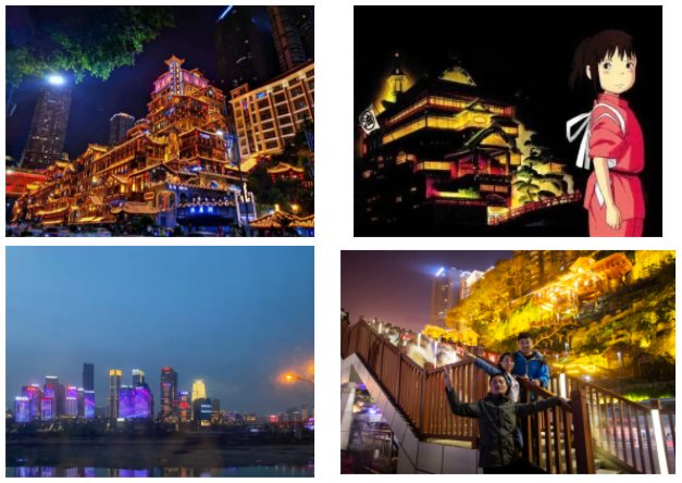 來了重慶怎么能不去跟《千與千尋》洗浴城外觀相似的洪崖洞呢,晚上我們便前往洪崖洞欣賞絢麗的夜景。白天的重慶,街上到處是老鋪子,十分接地氣。但是一到夜晚,竟有種不輸上海的貴氣和繁華。夜晚的洪崖洞極具魔幻色彩,璀璨夜景,流光溢彩,相映著嘉陵江水,以包容熱情的姿態接納四方游客人群,觥籌交錯間熱鬧非凡。穿梭于洪崖洞的街巷,我們驚訝于這里的別有洞天,層巒的建筑構造,仿佛置身于電影中,美的不真實,會沉迷,會神往,恍惚有種隔世感,這就是現實版的千與千尋。中國人心中最愛的,大抵還是這些璀璨熱鬧的人間煙火色。