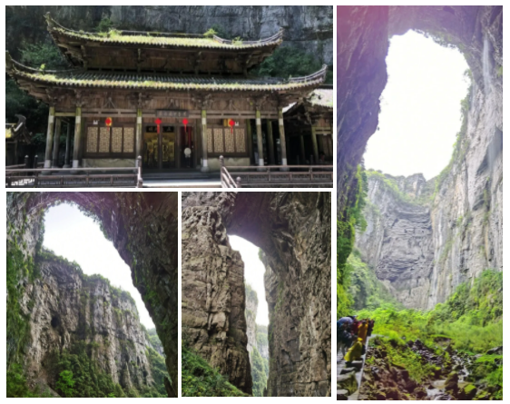 行程的第三天是玩轉武隆。一大早,我們便乘坐大巴前去。在到達目的地后,首先前往天生三橋,游覽天坑景觀。我們沿著修竹搖曳,老樹盤錯的崎嶇的石階謹慎下行。踏上高低不平的石階,往下看,白霧迷茫,偶現樹木婆娑,人影蠕動。因為天坑會有回音,已經到達坑底的人們大聲喊叫,只聞其聲,不見其人。還在天坑上面的人也積極回應,你唱我喝,好不熱鬧。 進入天龍天坑,峭壁環繞,好在谷底平坦開闊,有小橋流水,竹林茂綠,頭頂上好大一個窟窿,儼然是個天然輸氧吧。我們盡情呼吸濕潤潔凈的空氣,盡情觀景、拍照、暢想。到達天龍橋腳下,此時發現一座古式小院,既不是寺,也不是廟,而是電影《滿城盡帶黃金甲》的“天福驛站”。古式建筑的格局、結構、家具、陳設跟宮廷相仿。我們走進去,感受到與電影重合的一些場景。