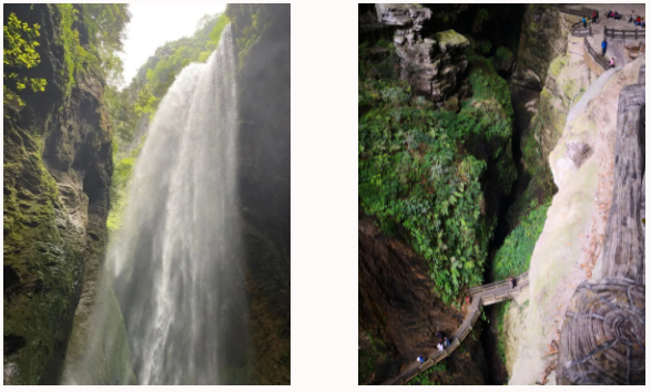 游覽完天生三橋,便前往龍水峽地縫。龍水峽地縫是億萬年前地殼變遷而形成的狹長山谷,屬典型的喀斯特地貌景觀,峽谷全長5公里。我們踏上了地縫石階,從山頂俯瞰峽谷,峽深壁立,薄霧如紗,似幽邃夢境。棧道彎曲迂回,壁泉隨處可見,濺起薄薄的水霧,飄灑眼前,令人渾身直打寒顫。我們走了幾程,忽見前面不遠處崖壁上飛瀑流泉,狹窄的棧道無處藏身,飛逬的泉水淋濕了大家的頭發。此時棧道已經十分濕滑,舉步維艱。我們不敢玩手機,都低頭認真觀看腳下的路,稍不留神就可能與大地來個親密接觸。鉆出蜿蜒曲折,狹窄悠長,鐘乳林立的天然地坑,走上地面,眼前豁然開朗,美好的武隆之旅也到此完美結束了,此刻美味的食物正敞懷迎接我們……