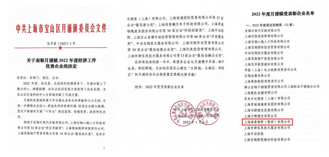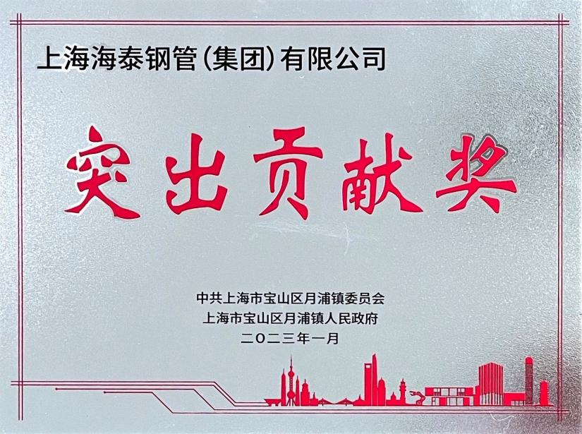 近日,中共上海市寶山月浦鎮(zhèn)委員會(huì)、上海市寶山區(qū)月浦人民政府,印發(fā)《關(guān)于表彰月浦鎮(zhèn)2022年度經(jīng)濟(jì)工作優(yōu)秀企業(yè)的決定》通知,表彰月浦鎮(zhèn)2022年度經(jīng)濟(jì)工作優(yōu)秀企業(yè)。上海海泰鋼管(集團(tuán))有限公司獲評(píng)“突出貢獻(xiàn)獎(jiǎng)”優(yōu)秀企業(yè)。