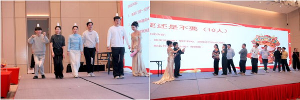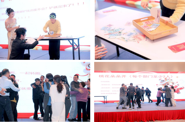 互動游戲環節更是趣味盎然,掀起一波又一波高潮。“金鏟鏟(蒙眼鏟錢)” 游戲中,參與者蒙眼手持小鏟,在鋪滿道具錢的區域奮力鏟錢,臺下觀眾加油聲不斷;“桃花朵朵開(繞圈抱團)” 考驗著大家的反應速度與協作能力,歡聲笑語此起彼伏;“夾紙運杯(夾著A4紙運杯子)” 則極具挑戰性,參與者小心翼翼地用A4紙運送杯子,緊張又刺激。?